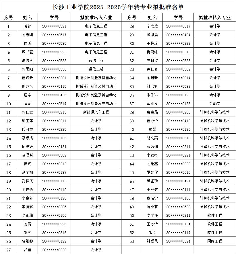根据教育部《普通高等学校学生管理规定》(中华人民共和国教育部令第41号)、《长沙工业学院学生学籍管理办法(试行)》和《长沙工业学院学生转专业实施办法(试行)》,学校遵循“公平、公开、公正、双向选择”的原则,经学生自主申报、笔试面试等环节,现将拟批准转专业学生名单公示如下: